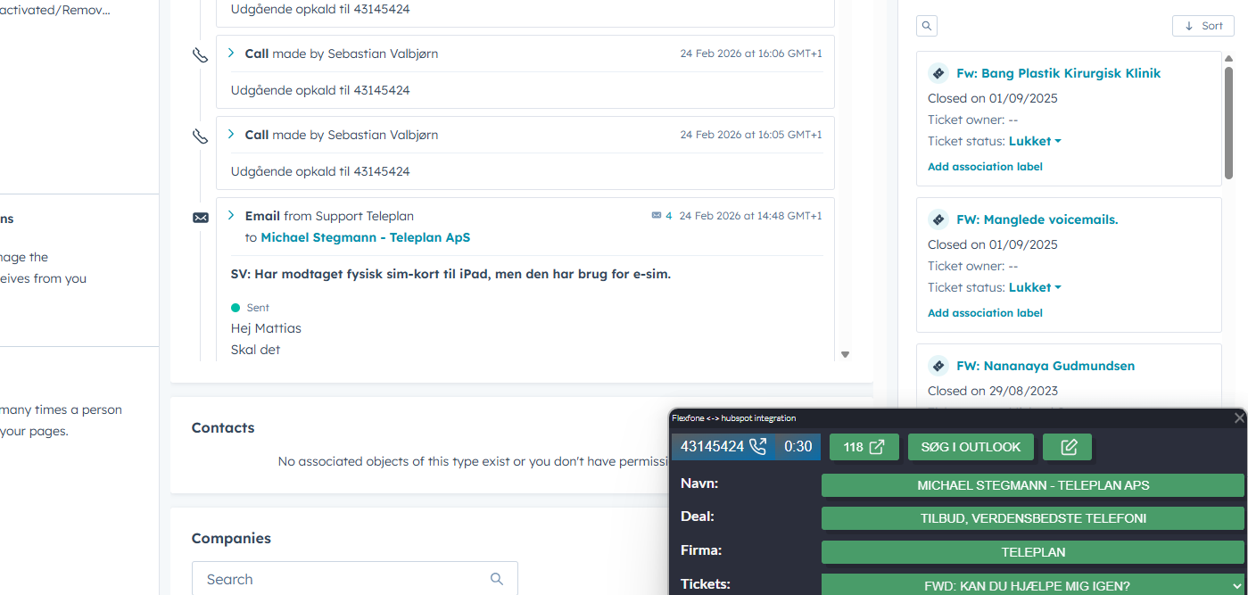 - Alle ind- og udgående opkald fra alle Flexfone-enheder registreres i HubSpot.
